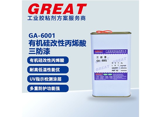 GA-1001 为低粘度单组份有机硅苯基树脂披覆三防漆,可室温固化,也可溶剂挥发后加温加速固化,应用于厚膜电路系统,多孔基材及印刷线路板的涂层保护.是一种特殊配方的涂料,用于保护线路板及其相关设备免受坏境的侵蚀,具有良好的耐高低温性能,固化后形成一层透明保护膜。